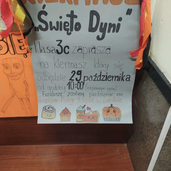 Dnia 29.10.2025 odbył się kiermasz słodkości pod hasłem „Smaki Dyni” organizowany przez klasę 3C, podczas którego zbierane były środki na rzecz Podopiecznych Lubelskiego Hospicjum dla Dzieci im. Małego Księcia.