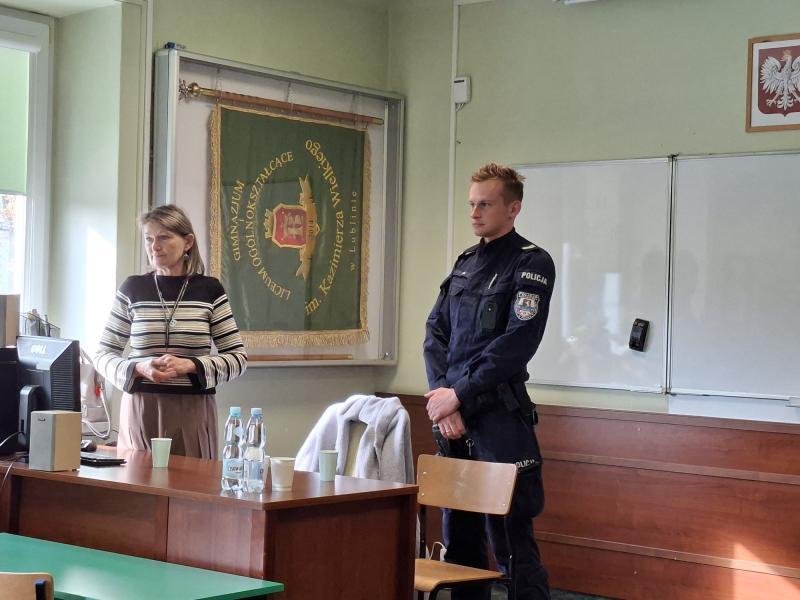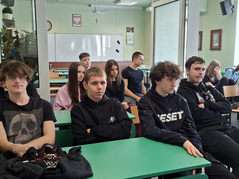 23 października i 4 listopada 2025 roku w naszej szkole odbyły się spotkania edukacyjne dla młodzieży z przedstawicielem Wydziału Prewencji Komendy Miejskiej Policji w Lublinie - Panią Elżbietą Konowałek i aspirantami z IV Komisariatu Policji w Lublinie, Panami - Karolem Myszakiem i Adamem Molendowskim. Zajęcia zostały zorganizowane w ramach działań profilaktycznych mających na celu podniesienie świadomości prawnej uczniów oraz kształtowanie odpowiedzialnych postaw w sieci i poza nią.