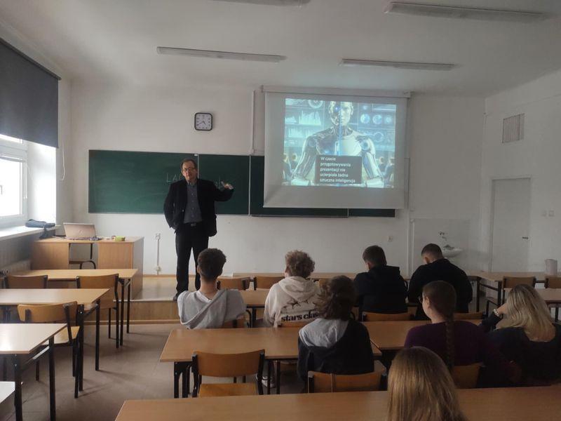 To tylko niektóre wydarzenia związane z początkami AI. Dalsze etapy jej rozwoju, związane były ze zwiększaniem mocy obliczeniowej komputerów oraz dostępem do informacji dzięki Internetowi. Obecnie przyzwyczailiśmy się już do czata GPT i innych czatbotów generujących teksty, obrazy, muzykę czy filmy, a także wspomagania przez systemy AI działania urządzeń codziennego użytku. A jaka w tym rola matematyki? Otóż, jeżeli chcemy naśladować funkcje logiczne, to matematyka dostarcza do tego najlepsze narzędzie, czyli funkcję. Właśnie funkcją matematyczną jest wspomniany powyżej model perceptronu McCullocha i Pittsa. W czasie wykładu uczniowie zapoznali się z jego budową, sposobem uczenia oraz możliwościami.